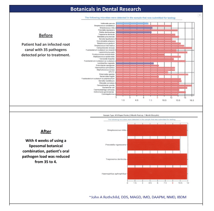 Botanicals have a long history of use in oral health; with excellent research on their ability to disrupt pathogenic biofilms and function as broad-acting antimicrobials. A recent study by Dr. John Rothchild, DDS, illustrated the potential of a liposomal botanical formula to significantly reduce pathogen load. In this study, 35 pathogens were detected, followed by 1 month of treatment with the botanical formula. The result can be seen below, with the bacteria reduced to four remaining pathogens. The study showed clearance of bacterial, viral, amoeba, and fungal pathogens.