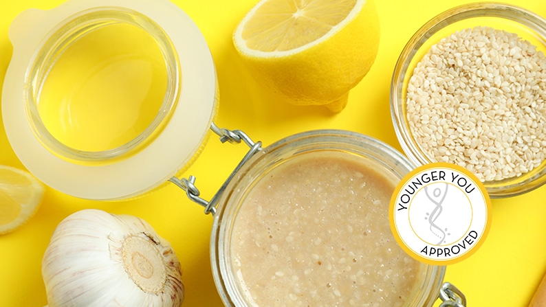 Seeds are powerhouses of DNA methylation, since they are rich in zinc, methionine, cysteine, magnesium, potassium, B3, B6, folate, and betaine. Although we emphasize sunflower and pumpkin seeds in the Younger You program, sesame seeds and tahini are a great alternative that packs a DNA methylation wallop.